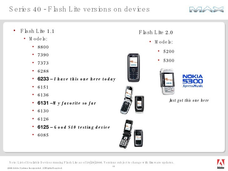 Samsung clp 365 firmware fix lcd laptop. Flash Lite development for Nokia devices Flash technology has been shipped on over 400 million Nokia phones across the globe. With Nokia, Flash technology becomes more broadly available, because it is supported across all Nokia platforms and is widely integrated with Nokia’s mobile WebKit browser. Adobe Flash Lite is a lightweight version of Adobe Flash Player, a software. This allows users to download Flash Lite applications from Verizon's 'Get It Now'. Series 40 (s40) platform is Java MIDP 2.0 and Adobe Flash Lite 3.0 enabled.